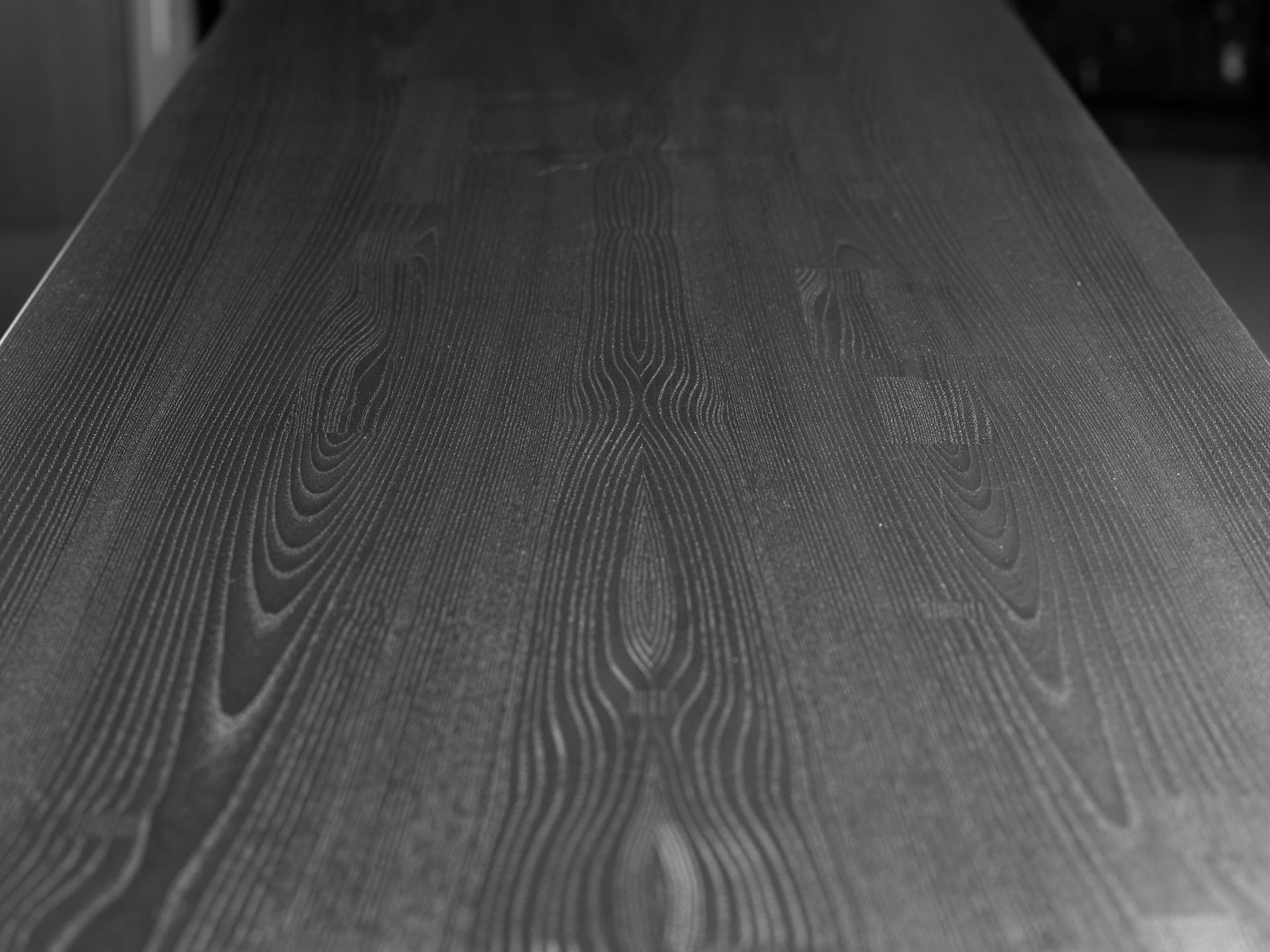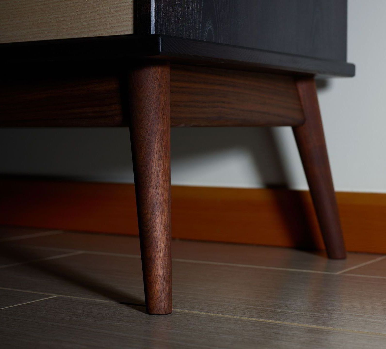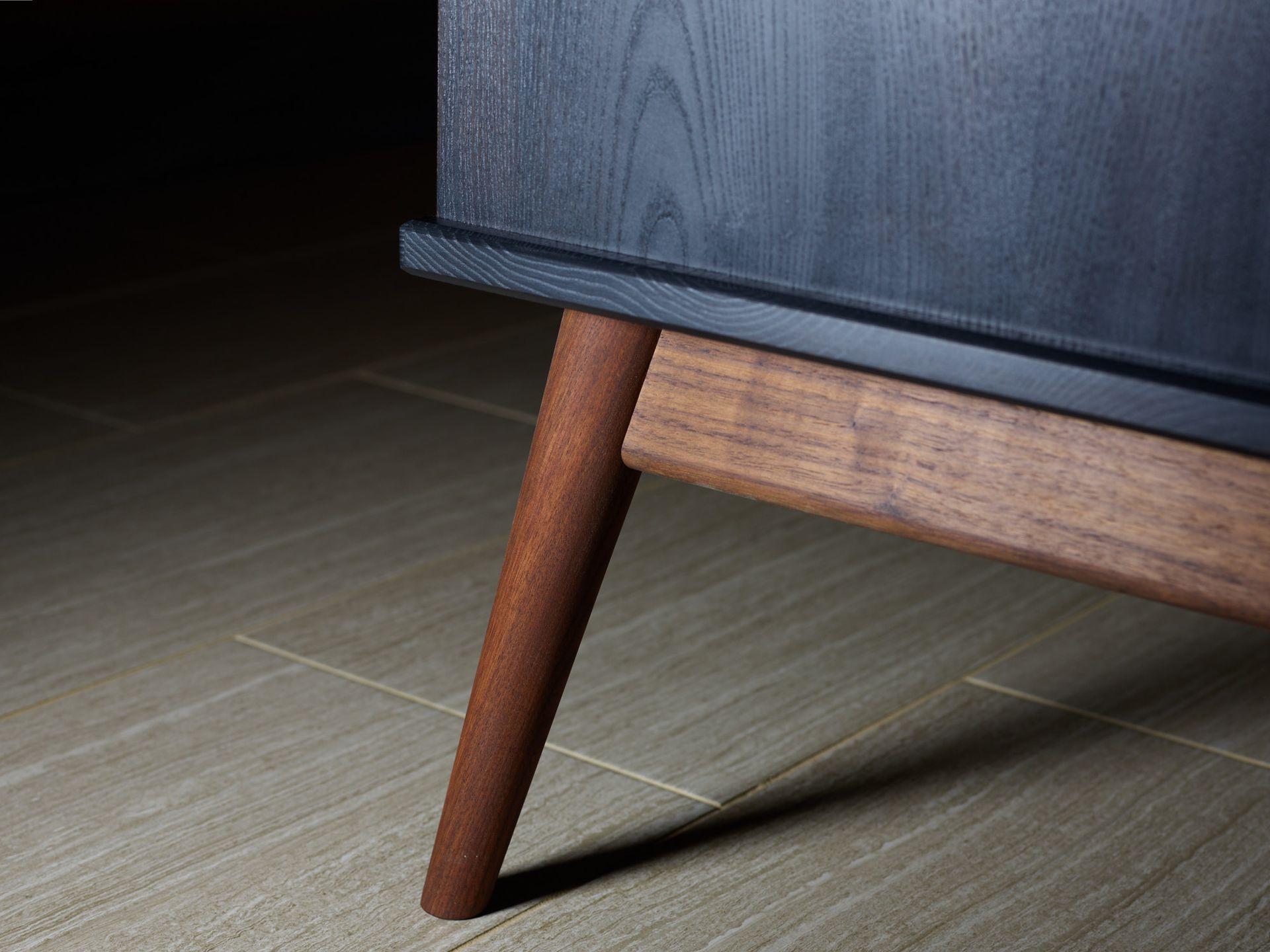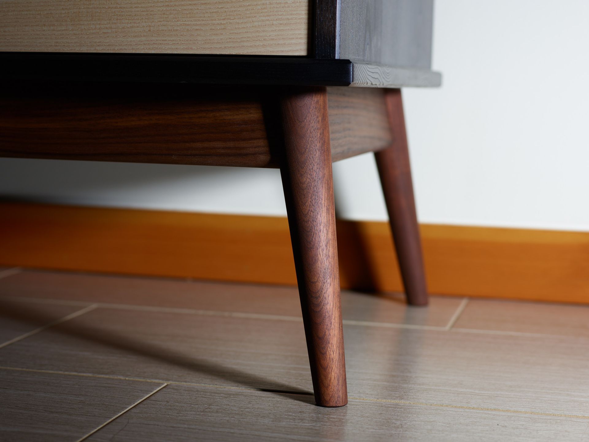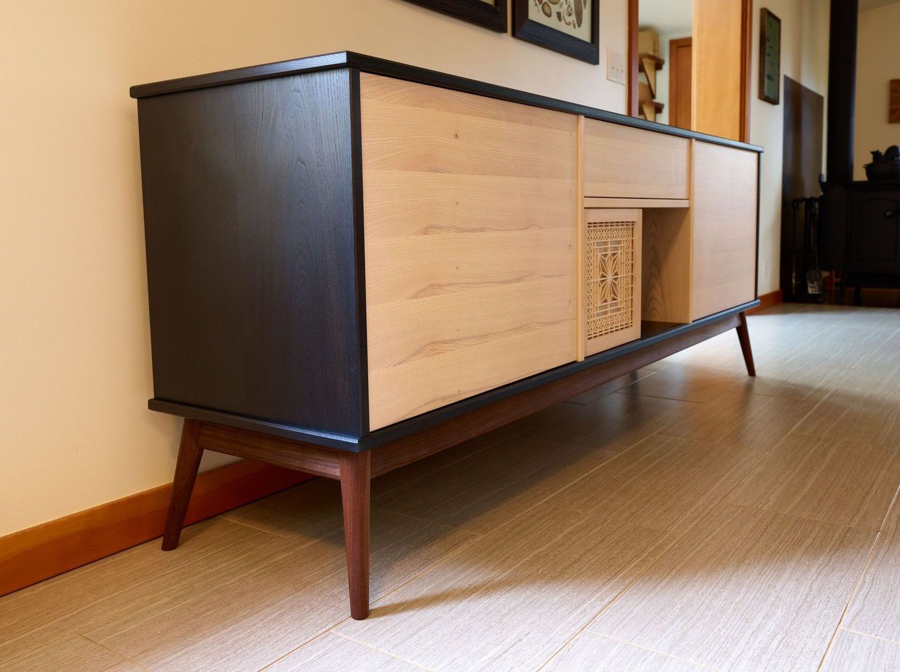 The sideboard is made from ash shop sawn veneer. The case veneer is book matched and the cabinet doors and drawer are continuous grain slip matched. All the wood came from the same tree that was slabbed and air dried in Kim's backyard. The doors and drawer are push to open. The drawer has dovetail joinery. The base is made from walnut. Kumiko sliding door with mulberry paper. 57 inlays on the top of the case create a mosaic patchwork. The piece is inspired by Danish Modern furniture.